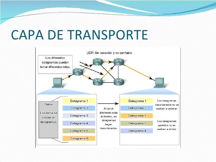 Capa de transporte: brinda los datos de enrutamiento, junto con los mecanismos que permiten conocer el estado de la transmisión. Comprende a los protocolos TCP y UDP.
